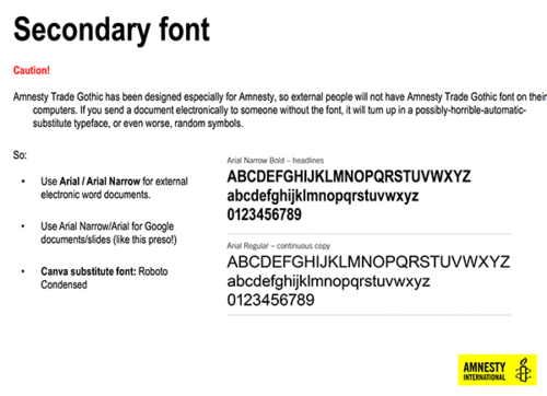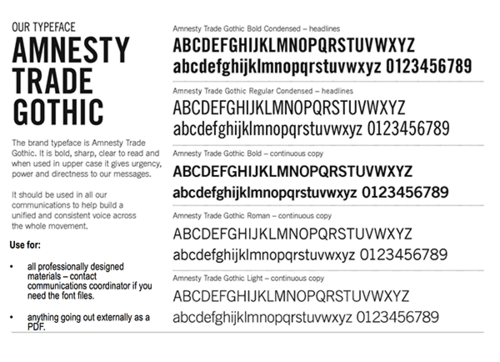 I found the style and branding guide from Amnesty International and noticed they had some brand specific fonts like Amnesty Trade Gothic. I reached out to them via email and luckily they were kind enough to send me the typeface.